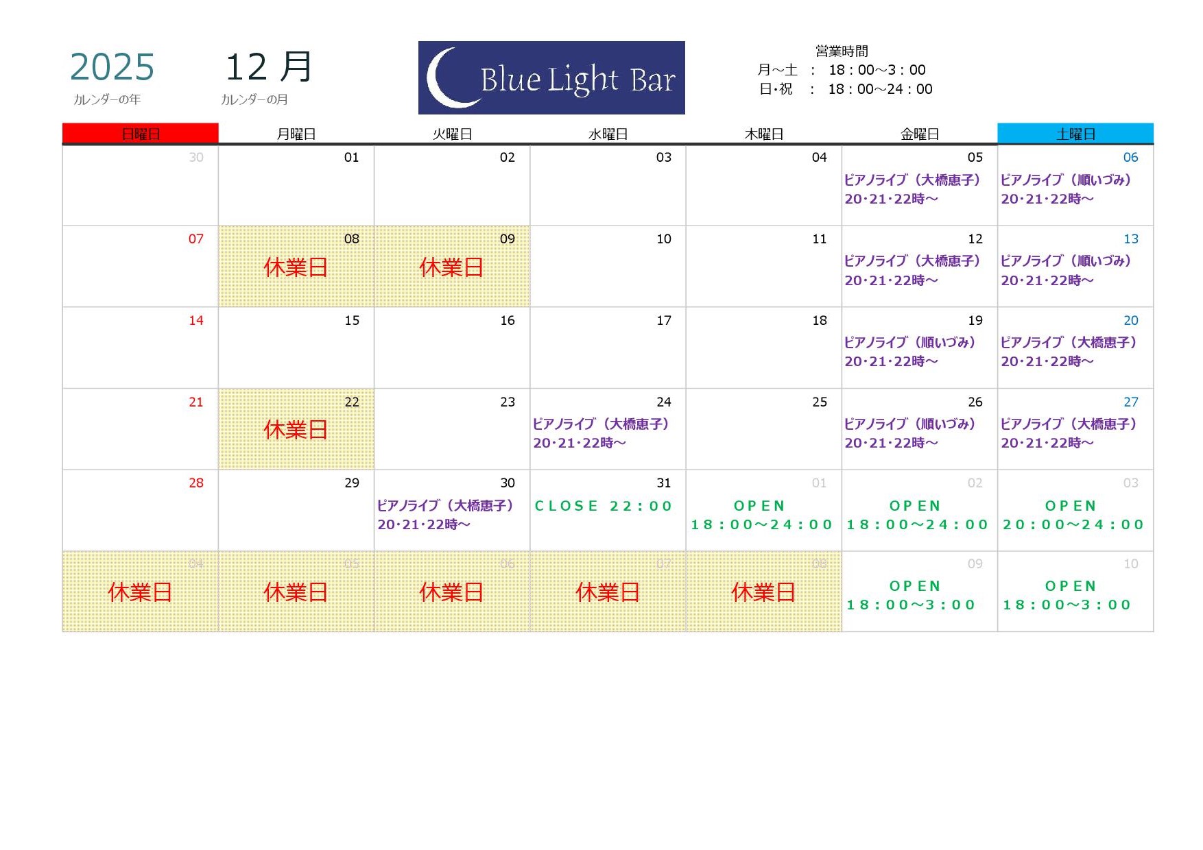 12月の休業日・ピアノライブ・その他営業時間の変更は以下の通りです。 大晦日は22時までの営業となっております。 新年は三が日は営業いたします。 1月4日(日)~8日(木)はお休みを頂きまして、1月9日(金)より通常営業いたします。 シェアする