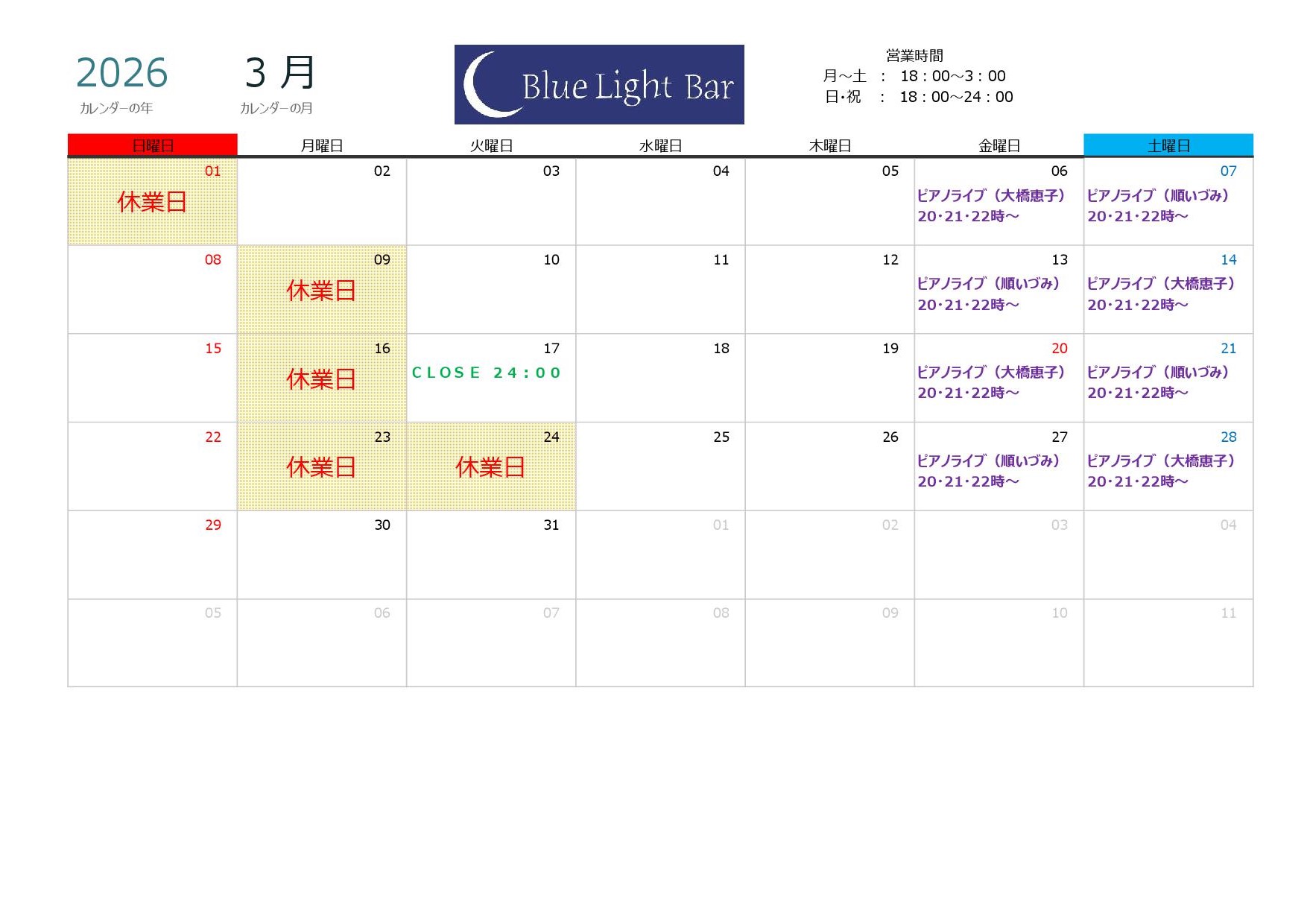 3月の営業日程は以下の通りです。